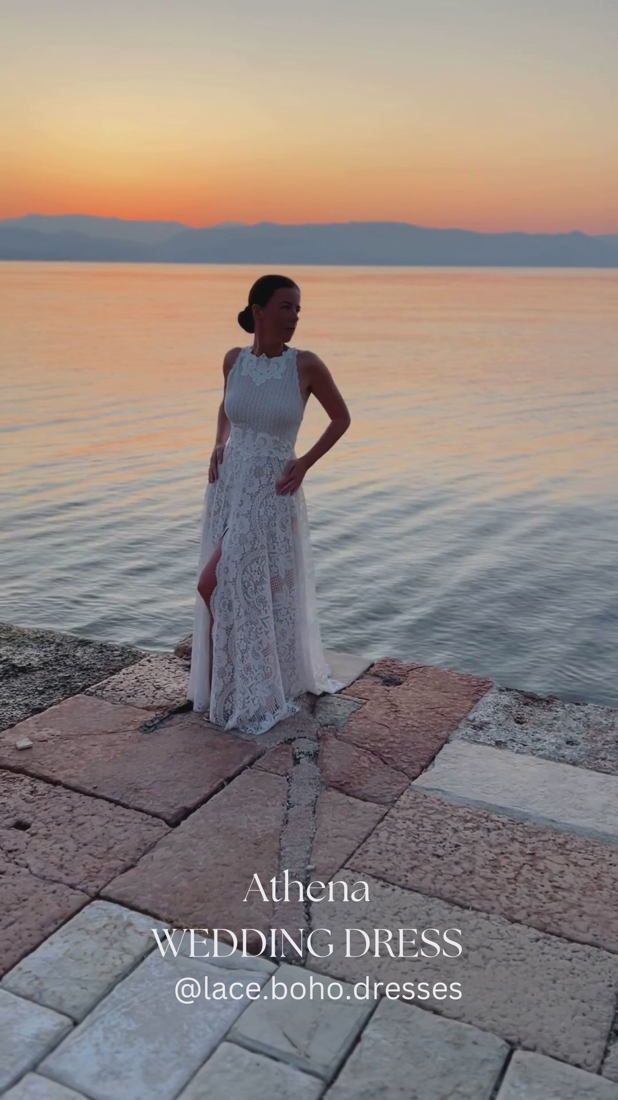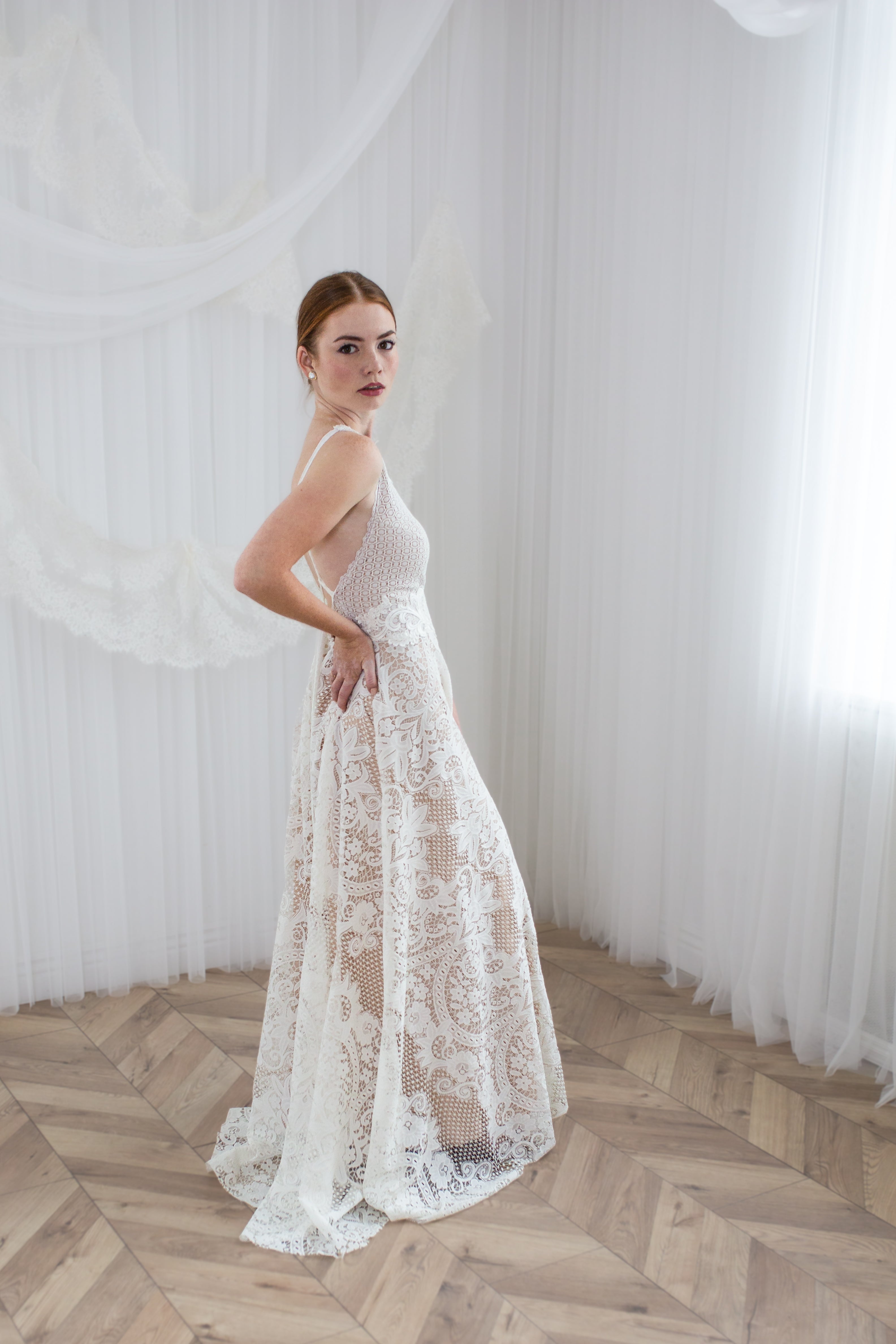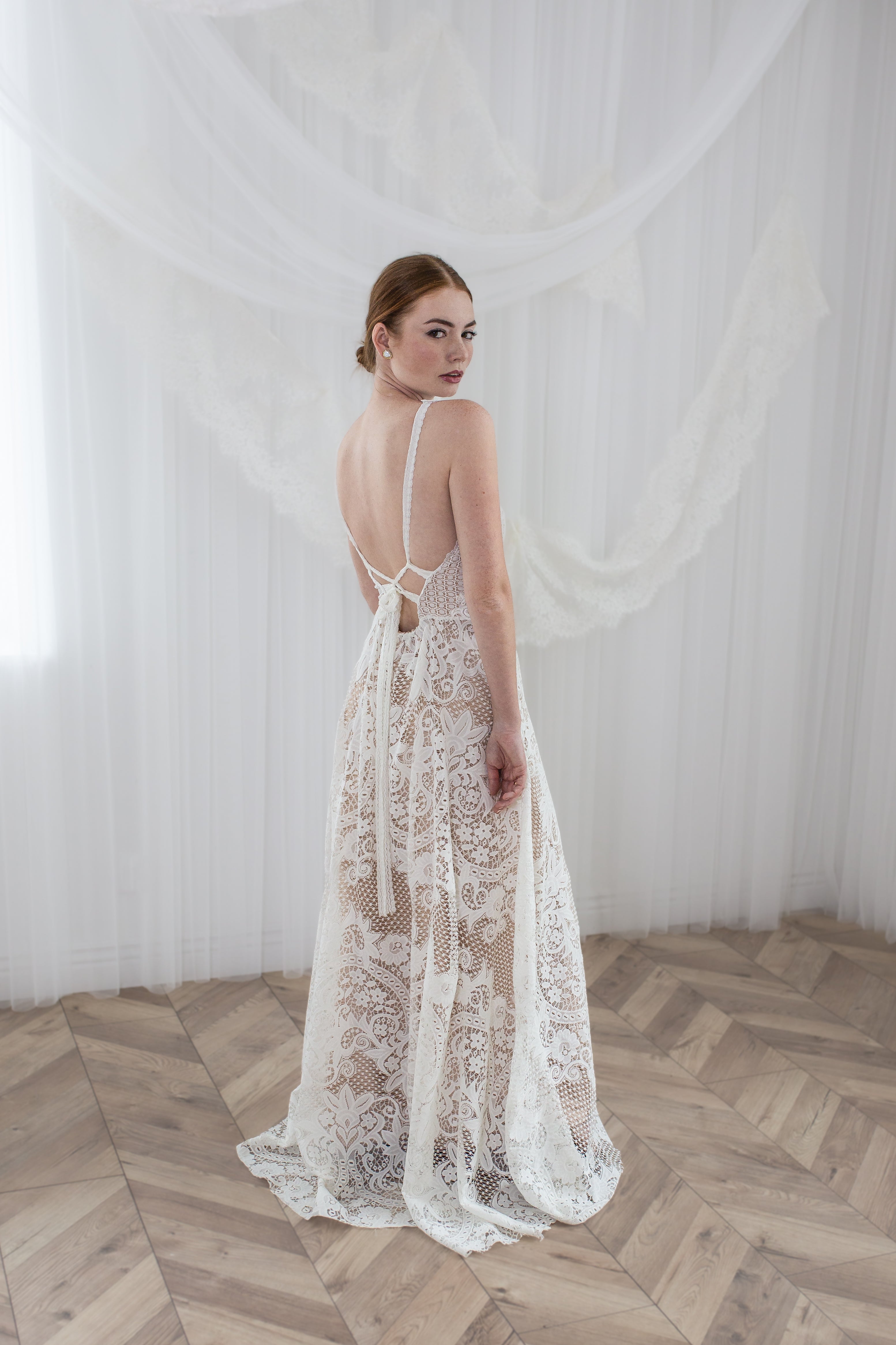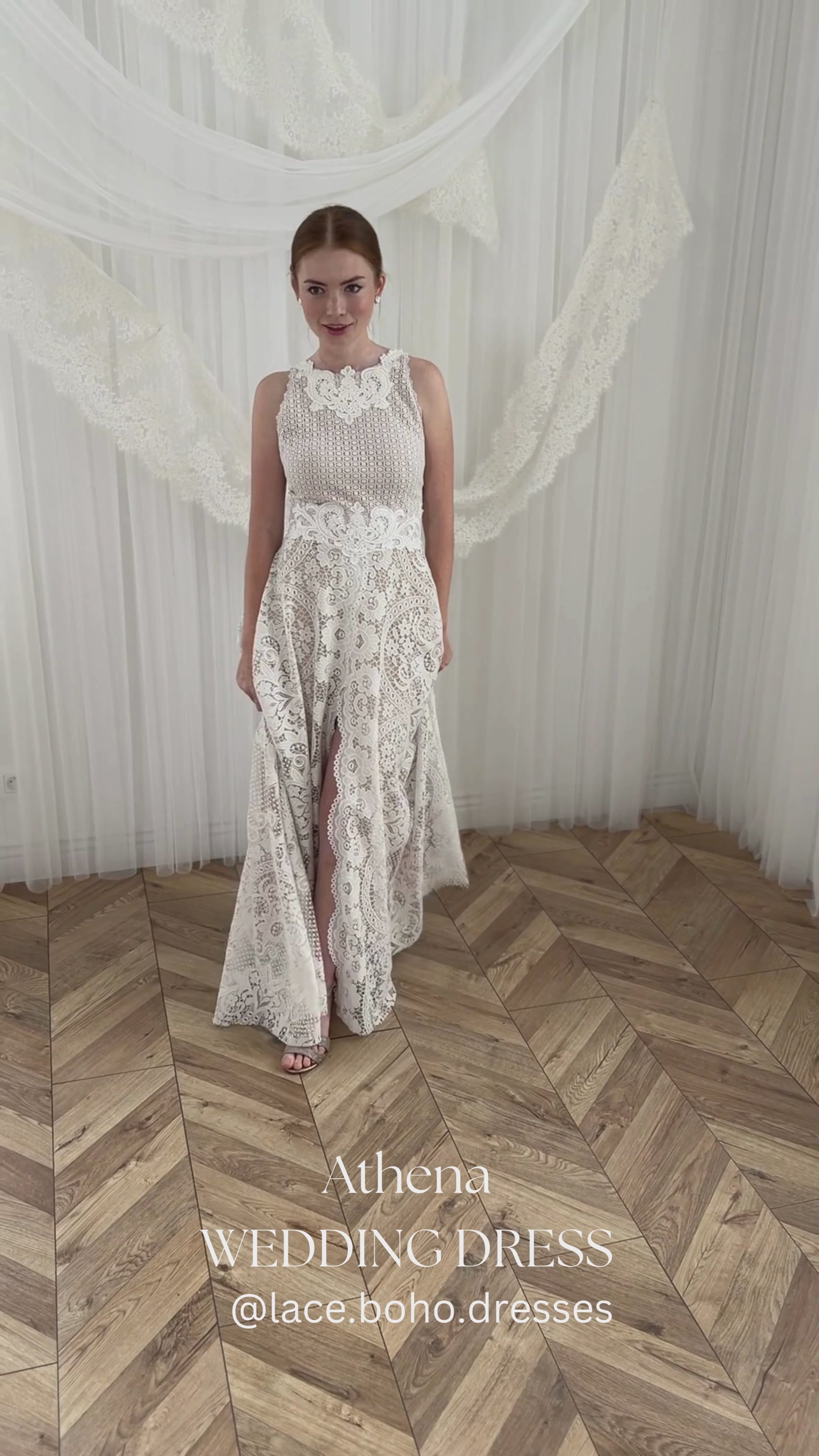 Refresh availabilityElevate your special day with our enchanting “Athena" wedding dress, a harmonious blend of bohemian spirit and timeless elegance. This dress features a beautifully detailed lace bodice decor with a high neckline for a classic yet whimsical look. The open back is adorned with delicate criss-cross straps, adding a touch of romance and modern flair.