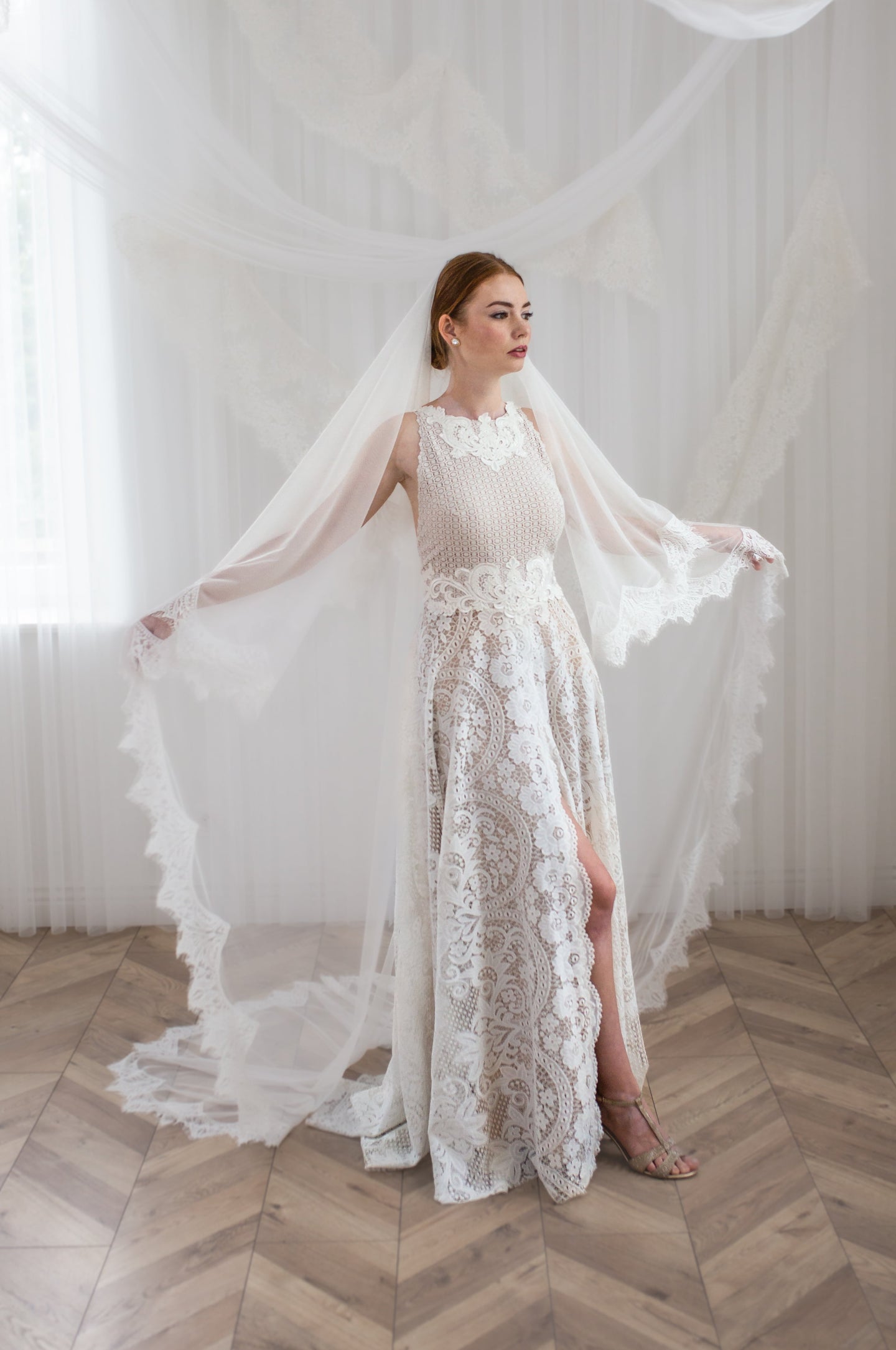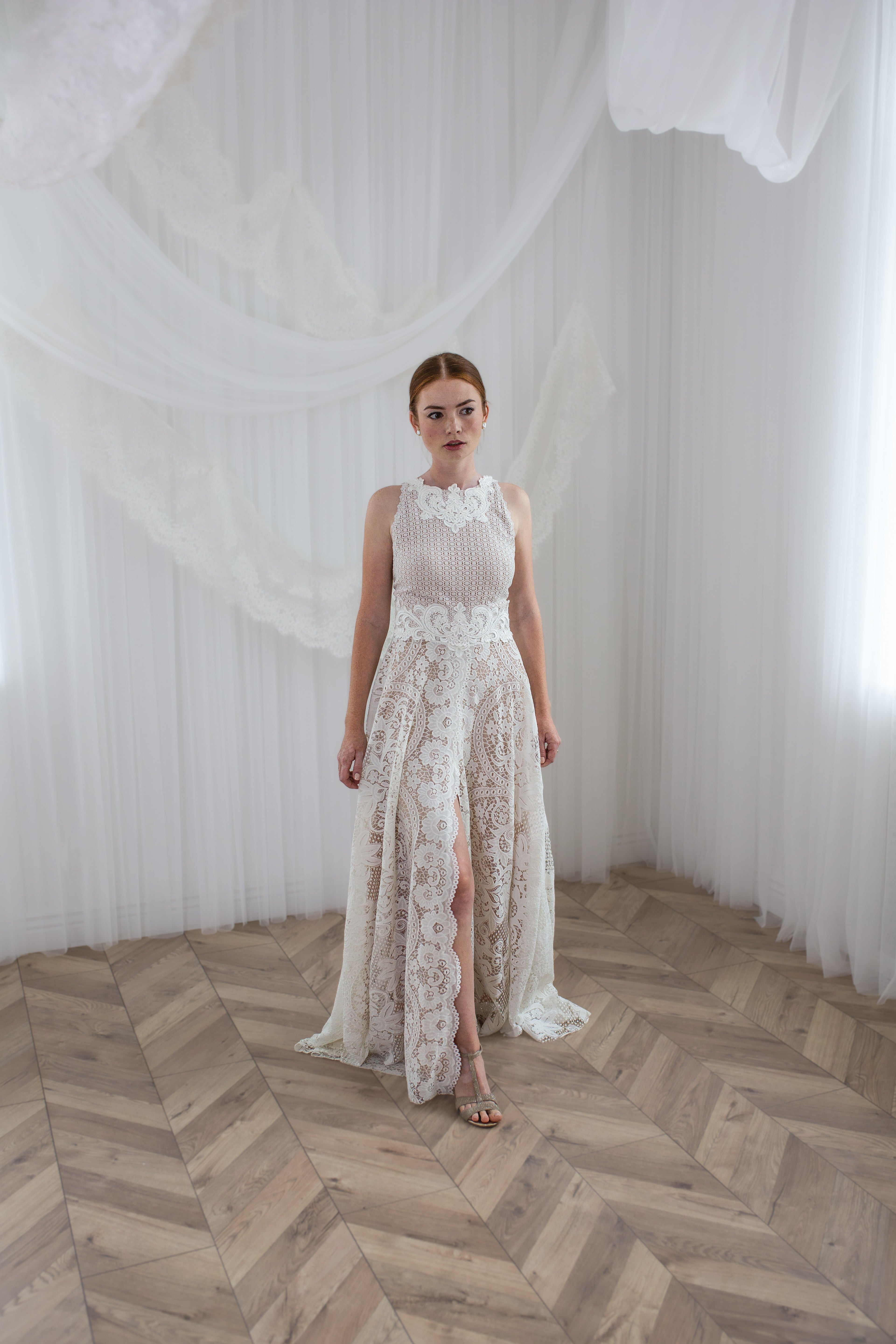 This skirt with leg slit, perfect for outdoor weddings or intimate ceremonies. Its intricate lacework and soft fabric ensure comfort while exuding elegance. Ideal for the free-spirited bride seeking a unique, nature-inspired style.